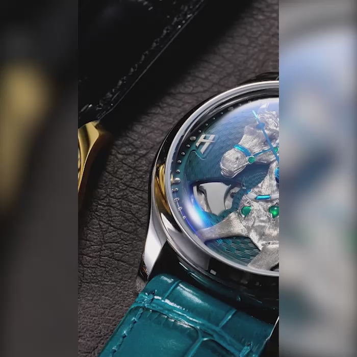 At the heart of the watch is a mechanical automaton horse, engineered to perform a precise and lifelike motion. When activated, the movement is accompanied by a chiming mechanism, adding a subtle acoustic element that elevates the experience beyond visual craftsmanship.
