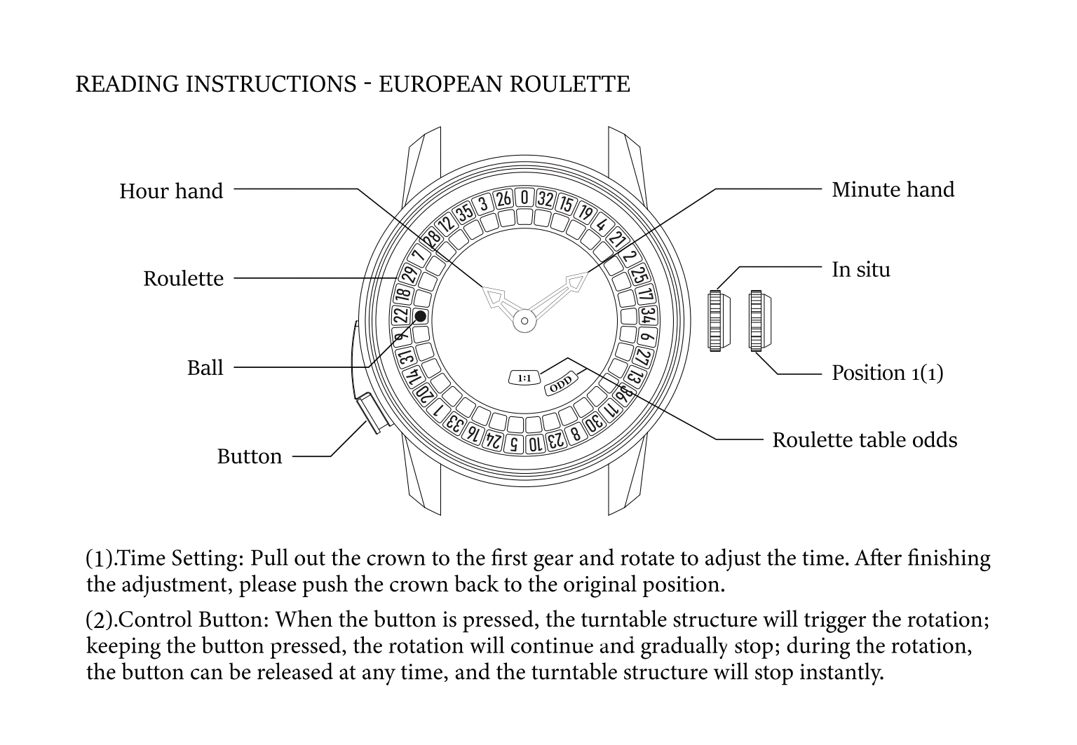 Inspired by the European roulette wheel, the back of the watch features a 37-number layout (0–36) in a refined roulette wheel watch design. A precision 18k gold bead spins across the betting area, allowing users to enjoy real casino roulette watch gameplay. From Column Bets and Dozens to Odd/Even, Red/Black, or Single Number bets, every spin brings suspense. If the bead lands on 0, all bets are lost—just like in a real casino.