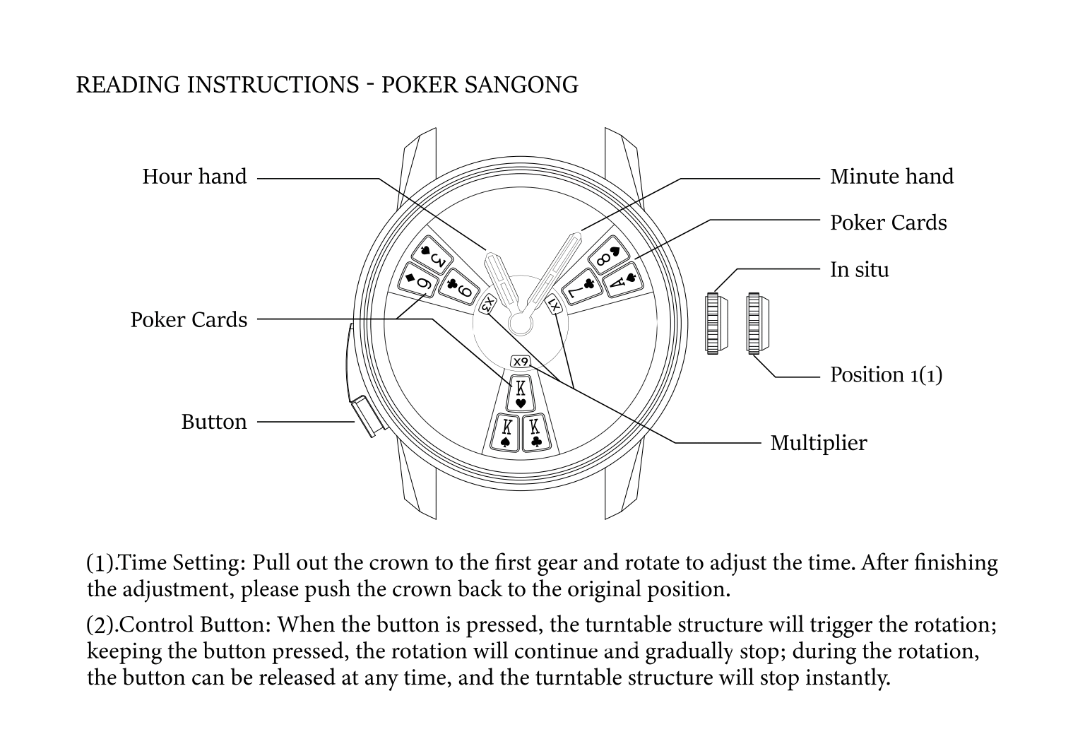 The watch features a dial showcasing all 36 cards of a standard deck, uniquely arranged in groups of three. These groups represent potential card combinations, mirroring the gameplay of Three-Card Poker. The set combinations on the dial reflect the hands used in the game, such as a Pair, Straight, or Three of a Kind, creating a visually stunning and interactive design. Luck is at the heart of Three-Card Poker, and the same spirit drives this watch. Its clever design lets wearers feel the thrill of the game anytime, anywhere, whether at the casino, online, or simply on the go. The Three-Card Poker Watch is more than just a timepiece—it's a celebration of chance, strategy, and timeless style, crafted for those who live for the game.