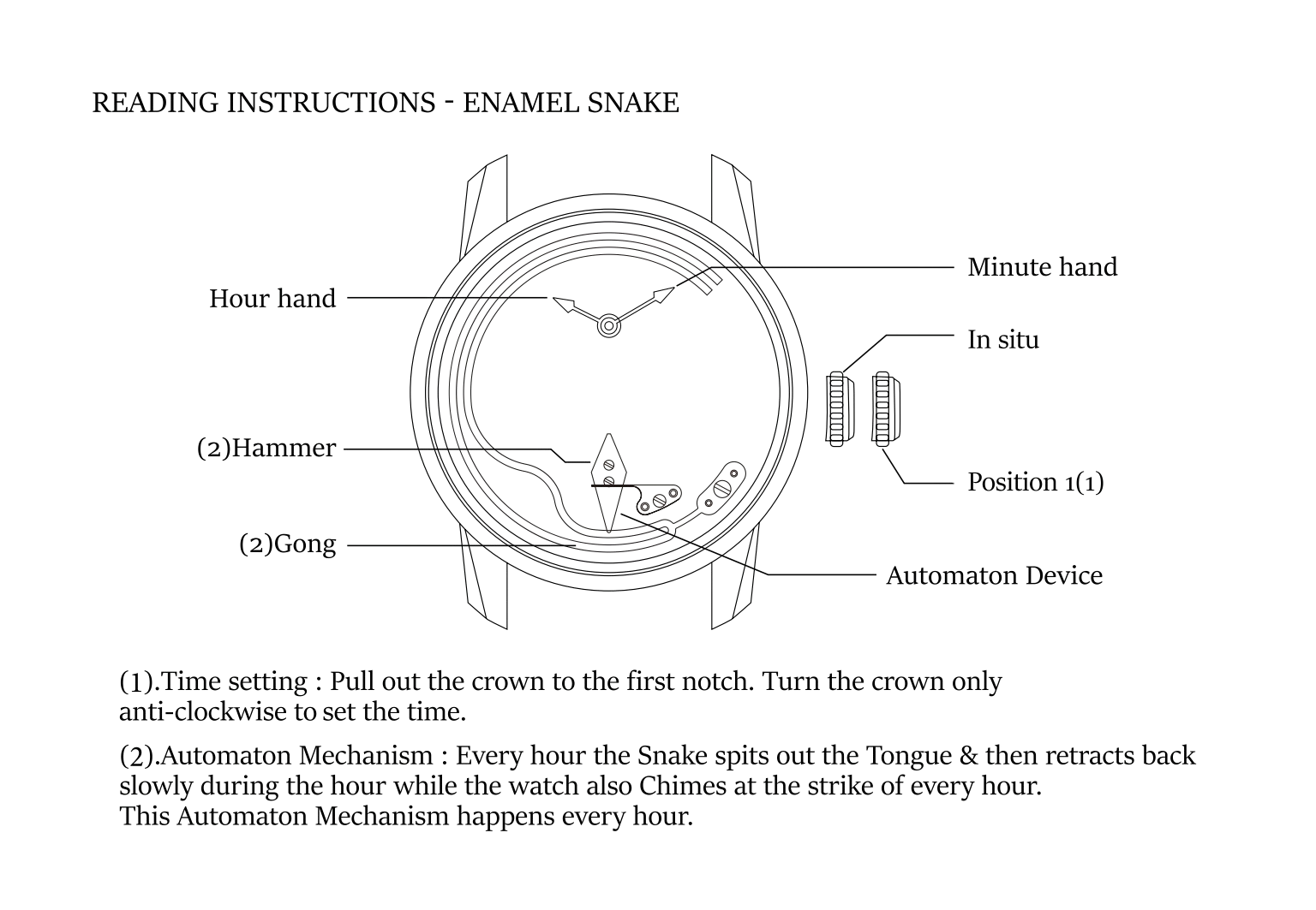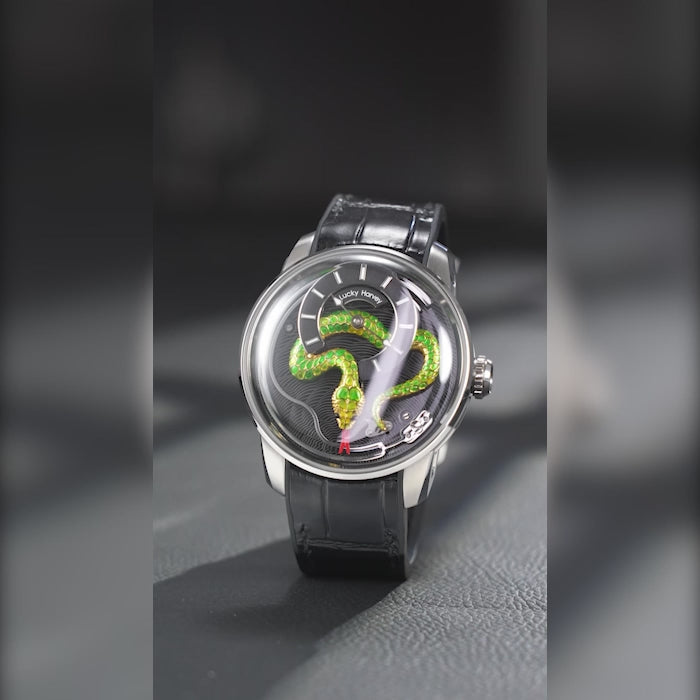 The Green Enamel Snake Automata Chiming Watch by Lucky Harvey delivers hypnotic beauty and mechanical sophistication. Limited to just 100 units, this piece showcases a luminous green enamel serpent, traced over a textured dial that provides depth and elegance. Each hour, the snake’s tongue extends to strike the gong, producing a crisp chime that highlights the watch’s automata capability.